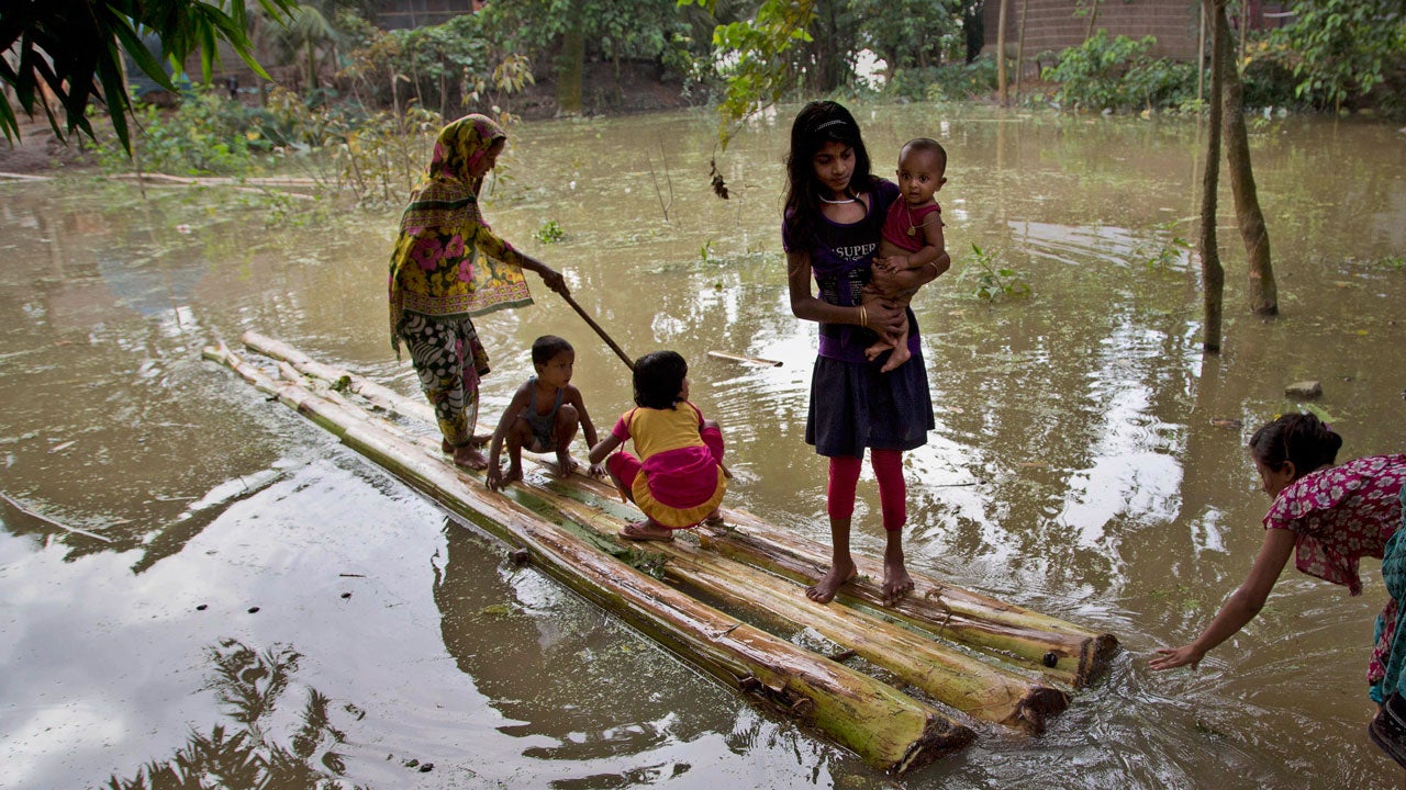 An Indian family prepare to cross floodwaters on a banana raft at Balimukh village, about 70 kilometers (43 miles) east of Gauhati, India, Tuesday, Sept. 1, 2015. (AP Photo/Anupam Nath)