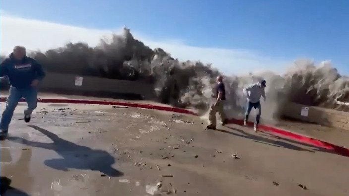 At least eight people were injured when a huge wave crashed over a sea wall during high surf warnings in Ventura, California.
