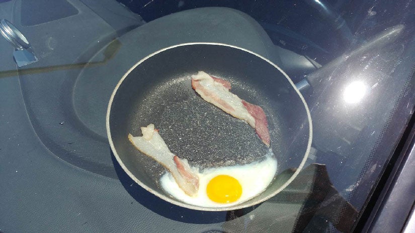 Mayes Boustead said the experiment began at 9:30 a.m. CDT last Thursday, and at about noon, they placed two pieces of raw bacon and an uncooked egg in a pan and left it on the dashboard of a car. As the air temperature inside the car soared to 177 degrees and the dashboard's surface temperature reached 211 degrees, the bacon and eggs only needed a few hours to cook.