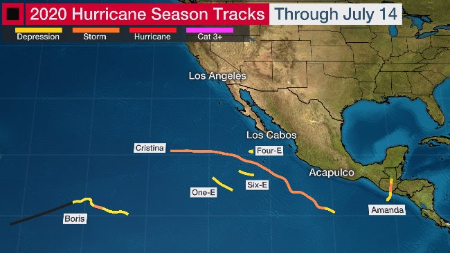 Eastern Pacific tracks in the 2020 season, through July 14. Only three tropical storms and three depressions had formed.