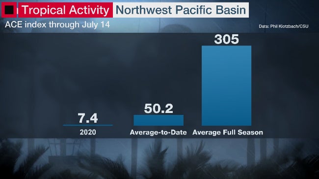 Tropical activity in the Western Pacific Basin, as measured by the ACE index, is only 15% of the average year-to-date through July 14, according to data compiled by Phil Klotzbach, a tropical scientist at Colorado State University.
