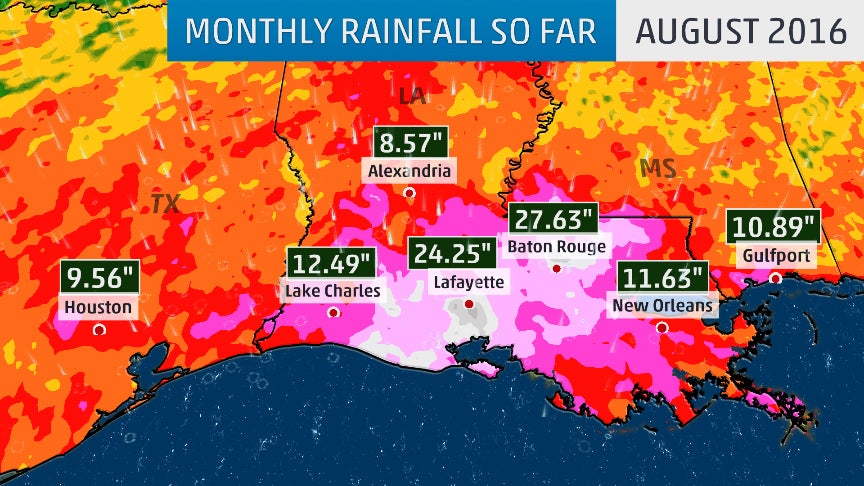In just a few days' time, parts of Louisiana received over 30 inches of rain. Through Aug. 23, it has been the wettest August on record in Baton Rouge, with 27.23 inches of rain. It's the second-wettest August for Lake Charles and the third-wettest for New Orleans.