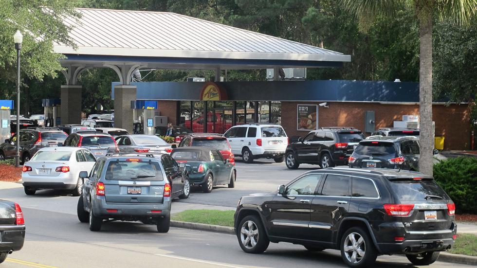 Motorists line up to fill their tanks in Mount Pleasant, S.C. in advance of Hurricane Matthew. (AP Photo/Bruce Smith)