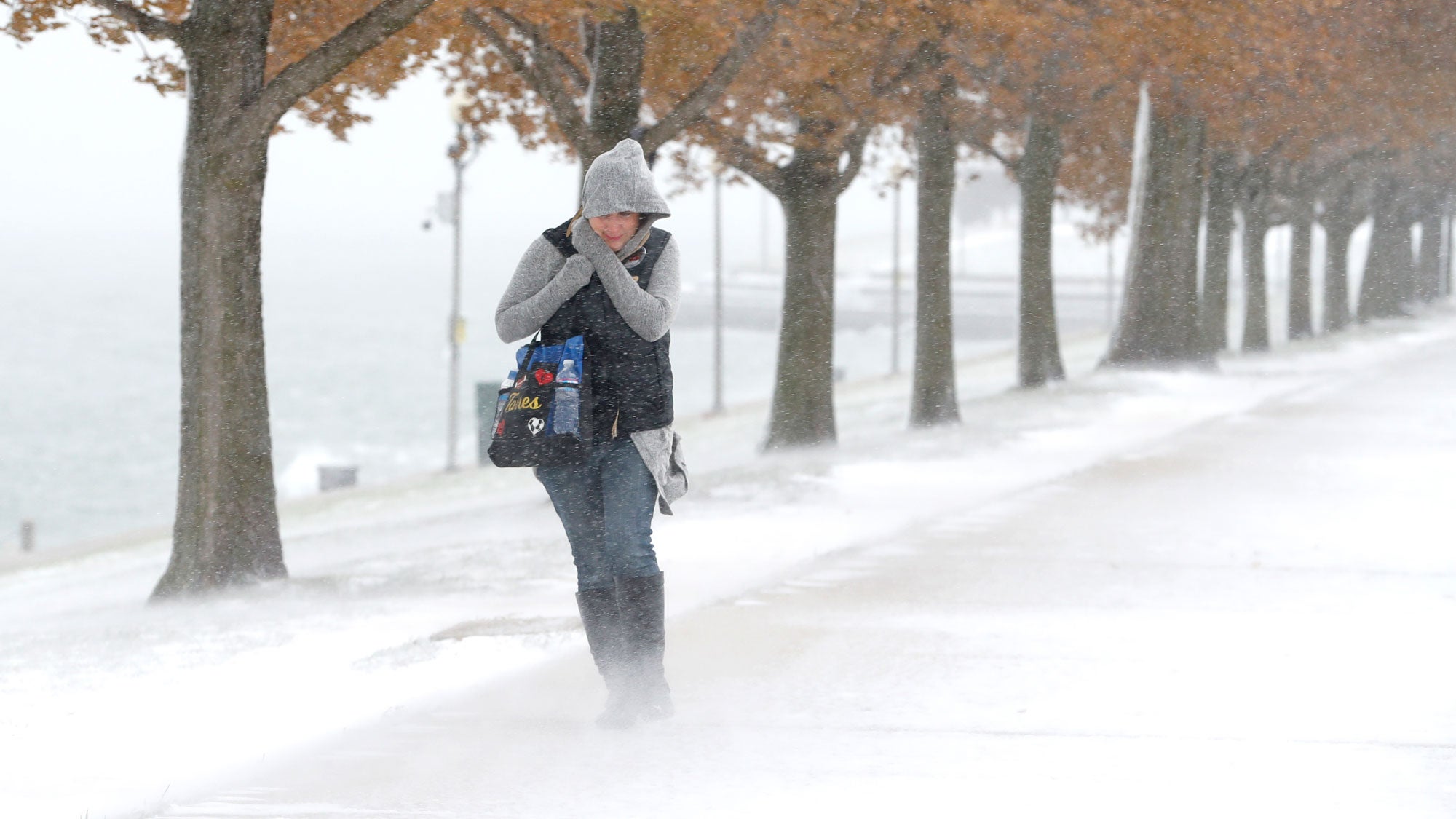 A woman walking the half-mile from Chicago's Adler Planetarium to the Chicago Aquarium braces herself in the stiff wind and blowing snow off Lake Michigan, Monday, Nov. 11, 2019, in Chicago.