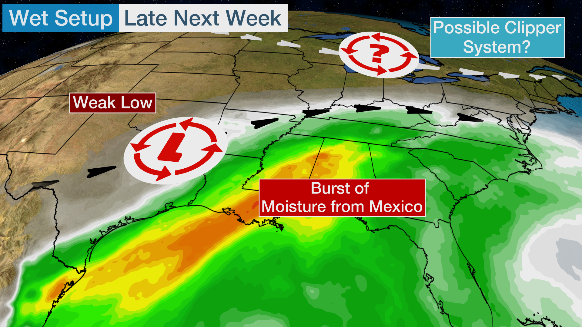 A cold front will also be pushing eastward through the Midwest and parts of the South, meaning moisture could get pulled northward, but if and when this interaction between the two systems occurs remains uncertain.