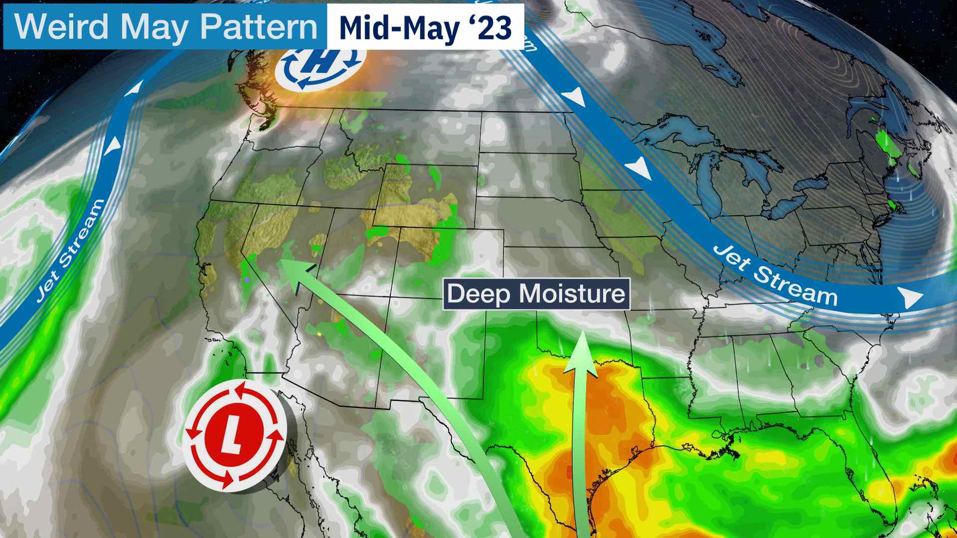 Then, a ridge of high pressure builds over the Rockies or Plains that taps more moisture in the atmosphere from the Gulf of Mexico or Southern Plains.