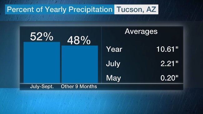 Average precipitation during the three month monsoon in Tucson, Arizona, is more than the other nine months combined.