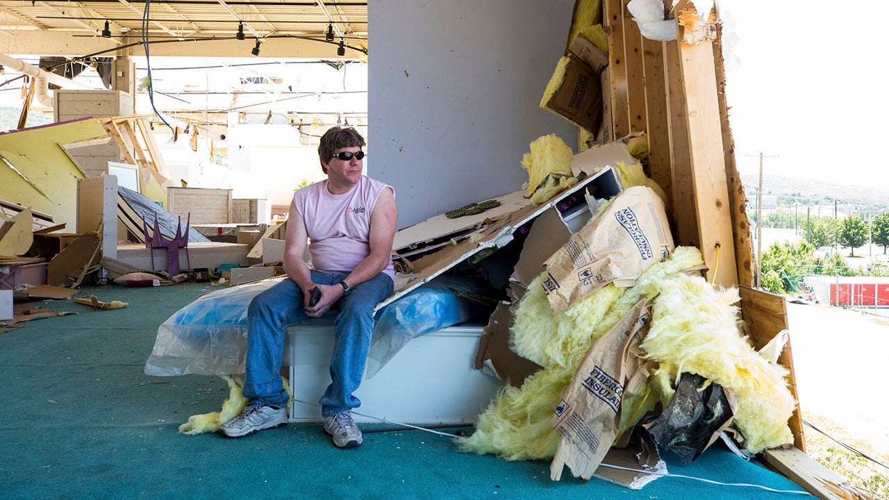 Ashley Furniture HomeStore co-owner Darrin Gallagher looks out through a missing wall on the second floor of the business in Wilkes-Barre Twp., Pa., on Saturday, June 16, 2018. Ashley Furniture was one of multiple businesses heavily damaged by a tornado on Wednesday night. Gallagher said he is actively looking for a temporary location for his furniture store and he expects it will take years to rebuild his damaged original location. (Christopher Dolan/The Citizens' Voice via AP)