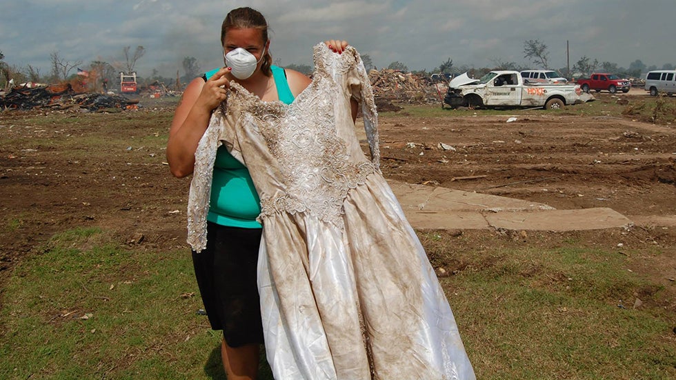After the tornado, the family picked through the rubble of their lives with the help of six volunteers to see what could be salvaged. One of the volunteers approached Hoke holding a dirty, ripped and frayed bundle of white cloth. When she took a closer look, she realized it was her wedding dress. "I felt this sudden surge of joy and happiness that something had actually been returned to me, something that couldn't be replaced," she said.