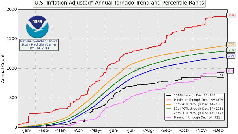 According to Dr. Greg Forbes, severe weather expert at The Weather Channel, there have been 838 tornadoes spawned in 2014 through Dec. 15. That still seems like a boatload of twisters, and it is, but when that number is visualized with averages, it tells a bigger story of the 2014 Tornado Shortage. Keep in mind that Forbes' numbers differ slightly from the SPC, but both have the year's tornado count well below the record low.