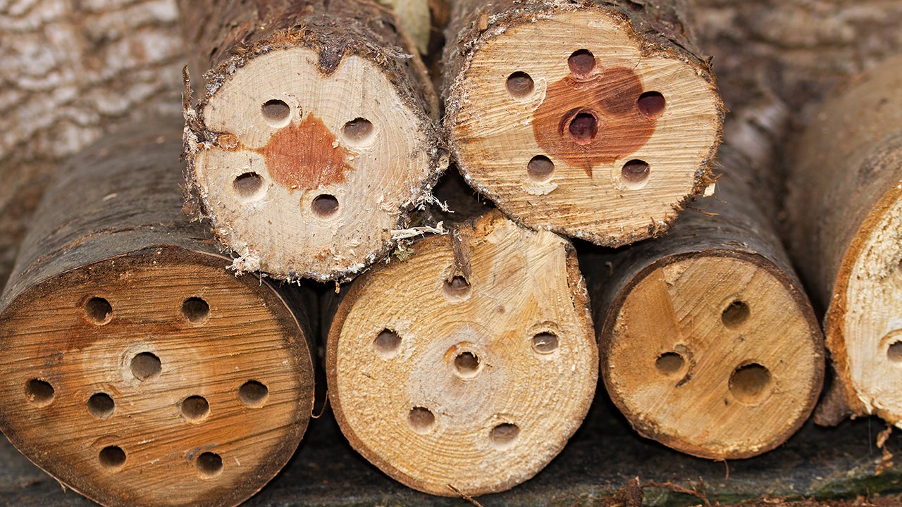 Orchard mason bees are great pollinators and they rarely sting, but they don’t live in nests like other bees, nor do they drill holes themselves. Instead, they live in the existing holes that they find in wood. So, to make a home for them, cut parts of your tree into small logs — or blocks — then drill holes about 3 to 5 inches deep into the wood. (Just be sure not to drill your hole all the way through). Then scatter the prospective bee “houses” throughout your yard and watch your new neighbors settle in.