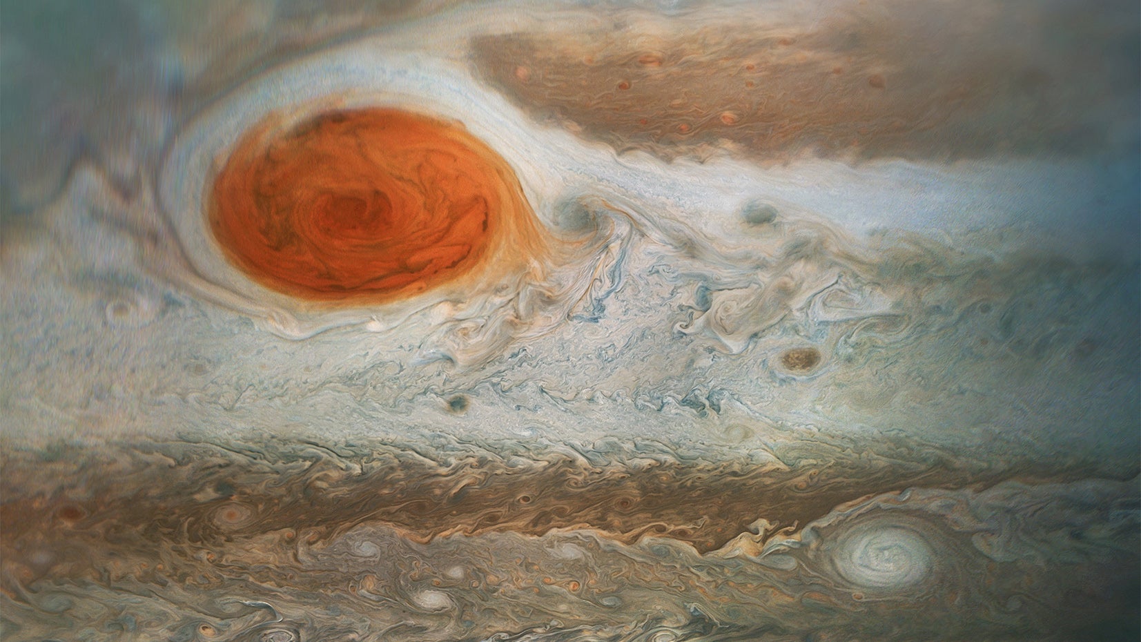 Another gigantic anticyclone, known as the Little Red Spot, is visible near the bottom of the second and third images. It is about the size of Earth and shouldn't be confused with the older and much bigger Great Red Spot.