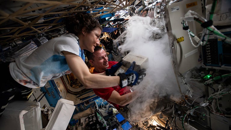 NASA astronauts Christina Koch and Andrew Morgan stow biological research samples into a science freezer located inside the U.S. Destiny laboratory module aboard the International Space Station.