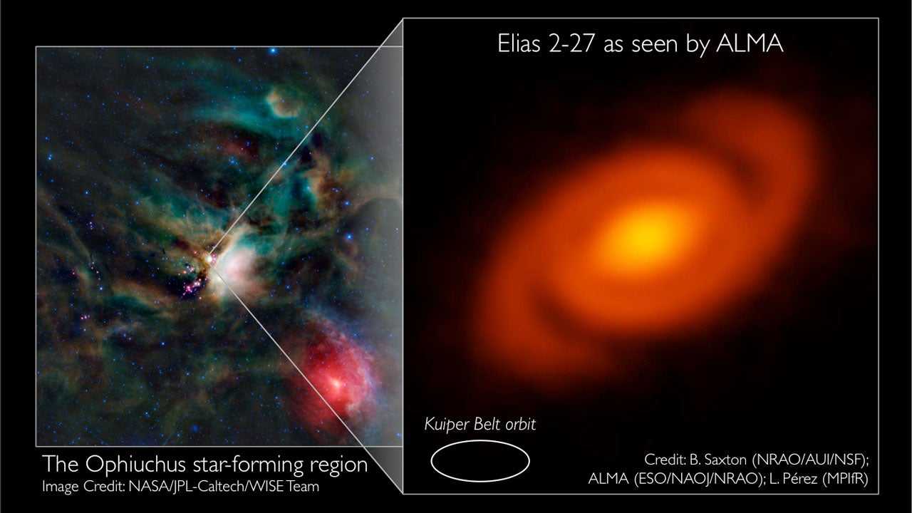 The infrared image on the left shows the Rho Ophiuchi star formation region at a distance of 450 light years. The image on the right shows thermal dust emission from the protoplanetary disk surrounding the young star Elias 2-27.