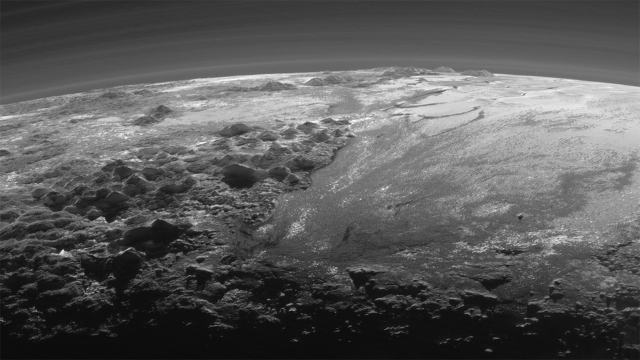 The smooth expanse of the informally named Sputnik Planum (right) is flanked to the west (left) by rugged mountains up to 11,000 feet high.