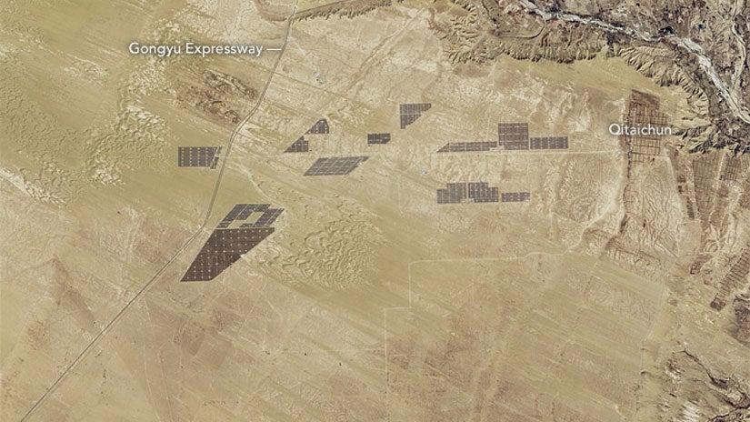 In China’s Qinghai Province, 4 million solar panels are visible from space, soaking up sunlight. The panels are part of the largest solar farm in the world, Longyangxia Dam Solar Park, which NASA has chronicled in satellite images.