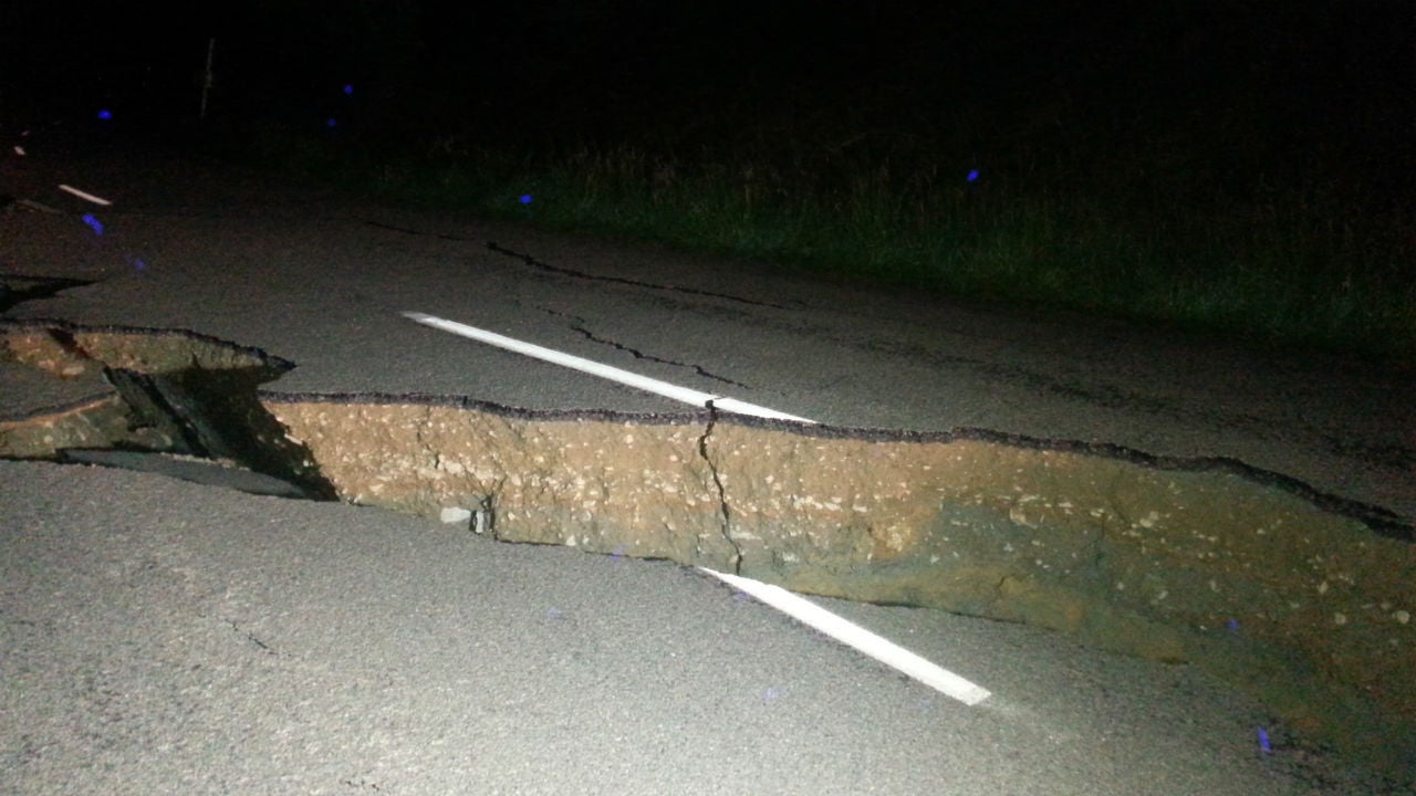 A large fissure runs along Kaikoura Road about two hours north of Christchurch Monday, Nov. 14, 2016, after a major earthquake struck New Zealand's south Island early Monday.