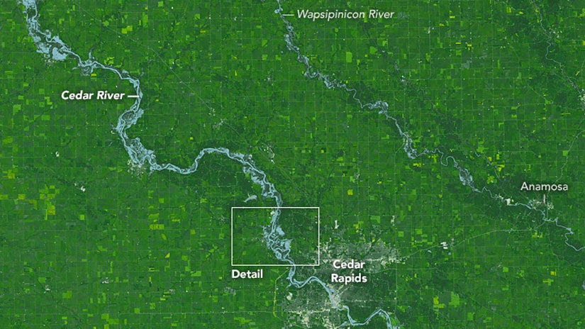 Images captured by NASA’s Operational Land Imager show Iowa’s swollen Cedar and Wapsipinicon rivers.
