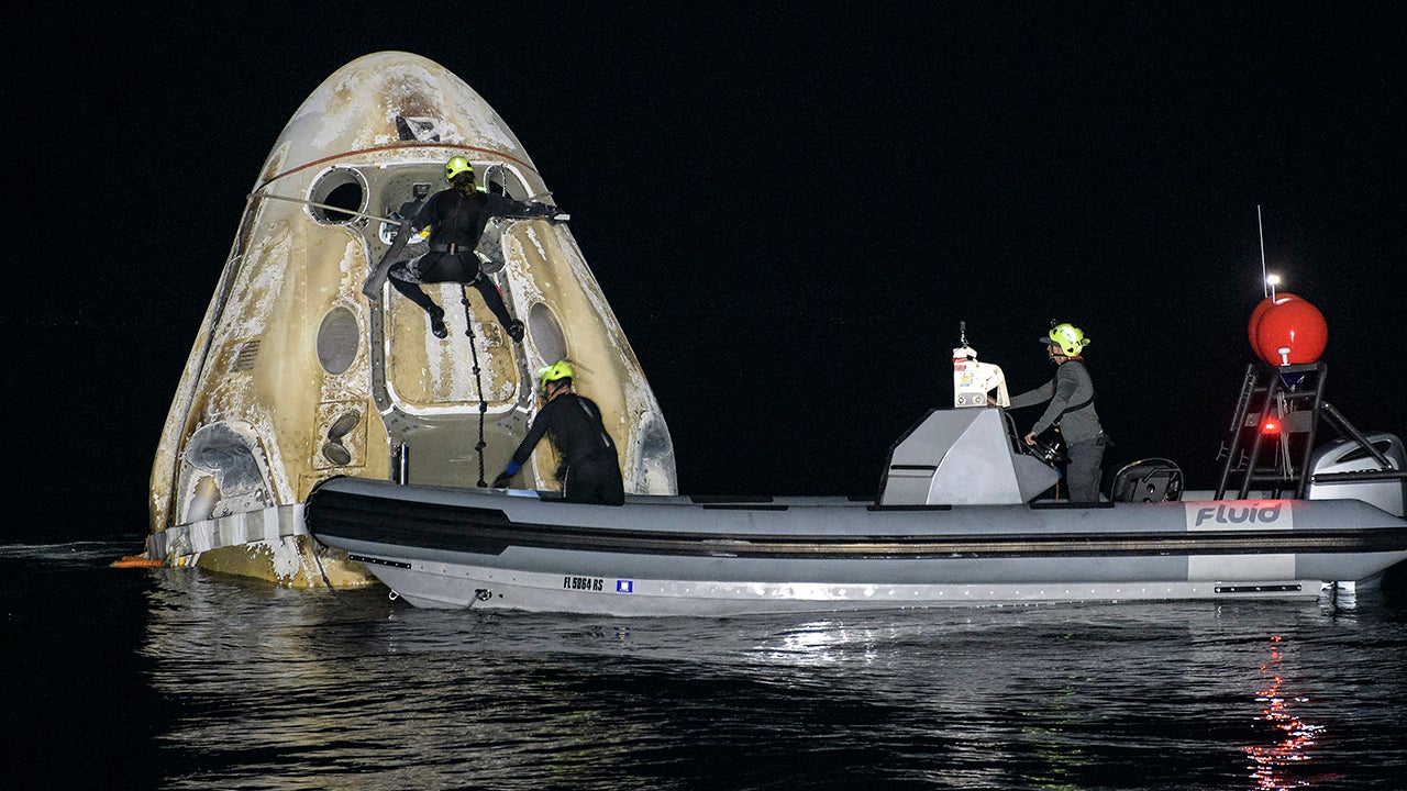 Four astronauts return to Earth in their SpaceX Dragon capsule after six months aboard the International Space Station.