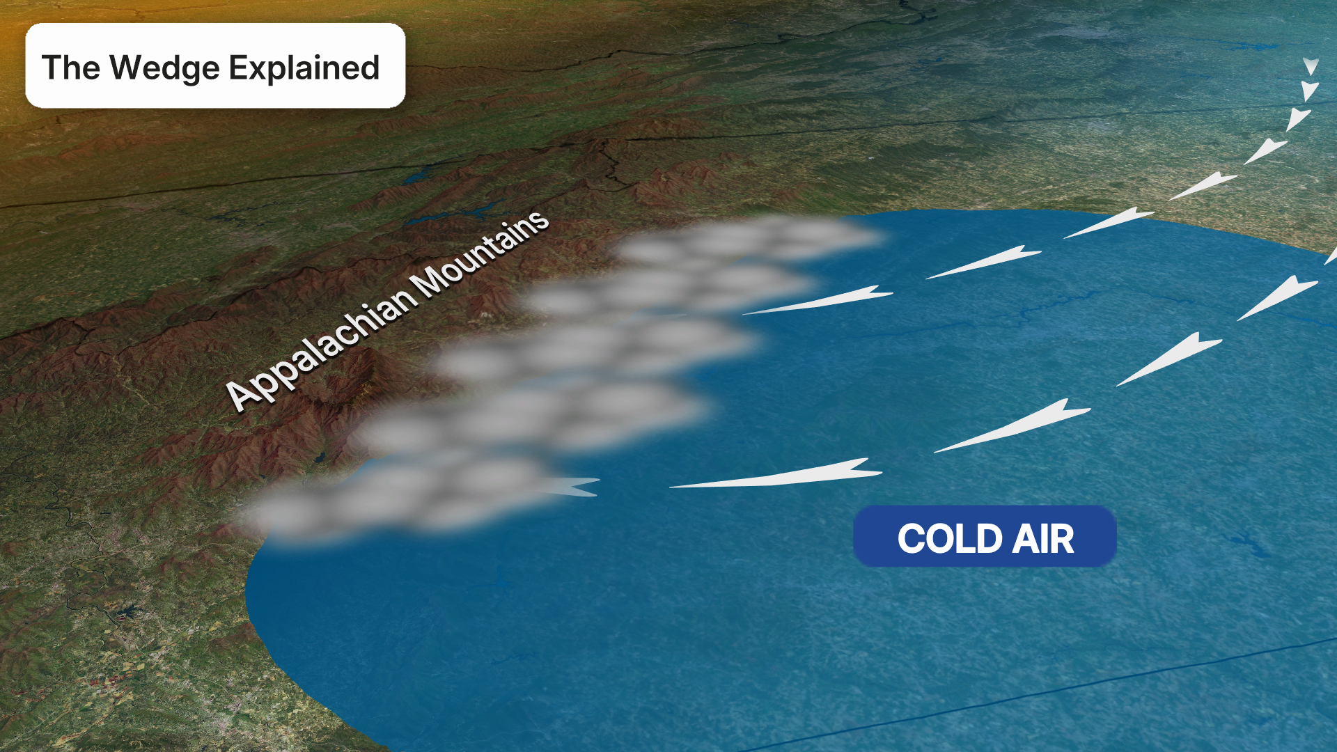 In the southeastern United States, “the wedge” refers to a weather pattern formally known as cold air damming. It happens when a shallow layer of cool, dense air becomes trapped against the eastern side of the Appalachian Mountains.