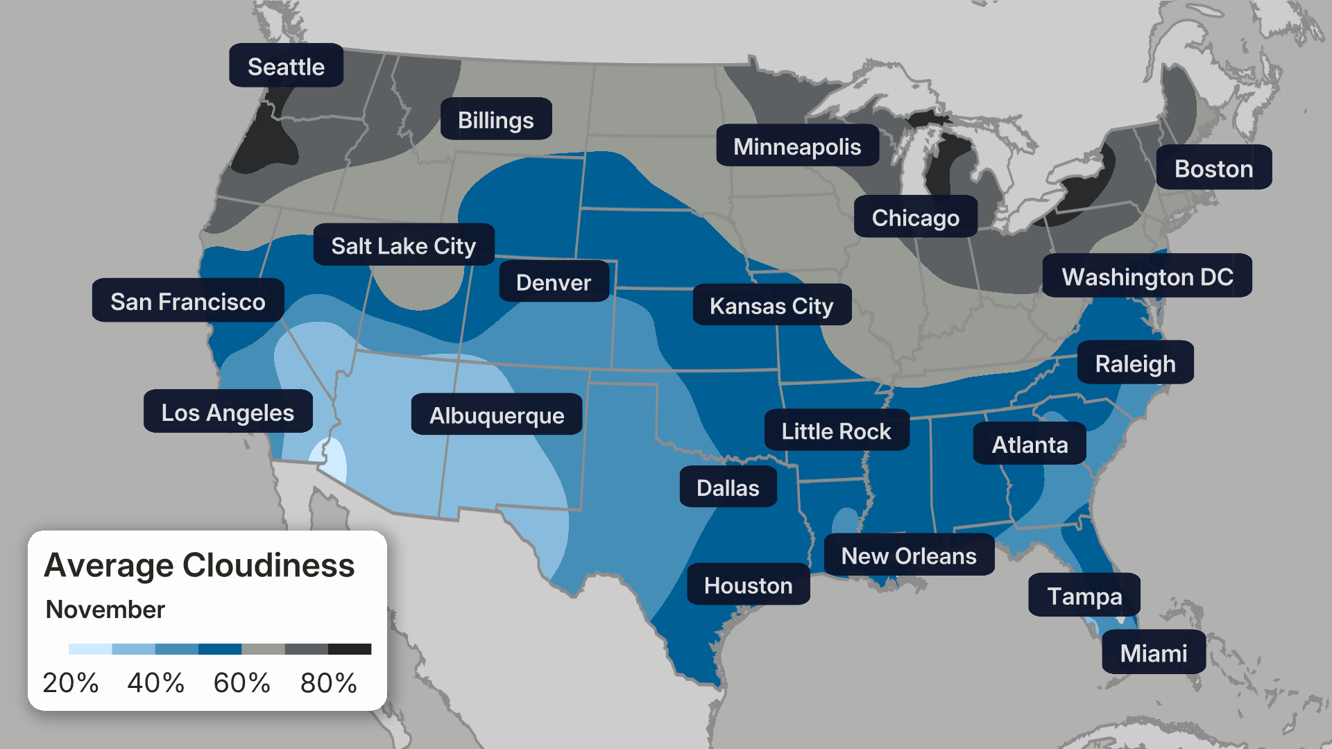 November kicks off a cloudier time of year: It's usually the cloudiest month of the year in parts of the Northern Plains and upper Midwest, including the Twin Cities and Milwaukee, Wisconsin, according to climatologist Brian Brettschneider. The cloudy peak arrives in December in other parts of the Midwest and Northeast, but November kicks off all the gloom.