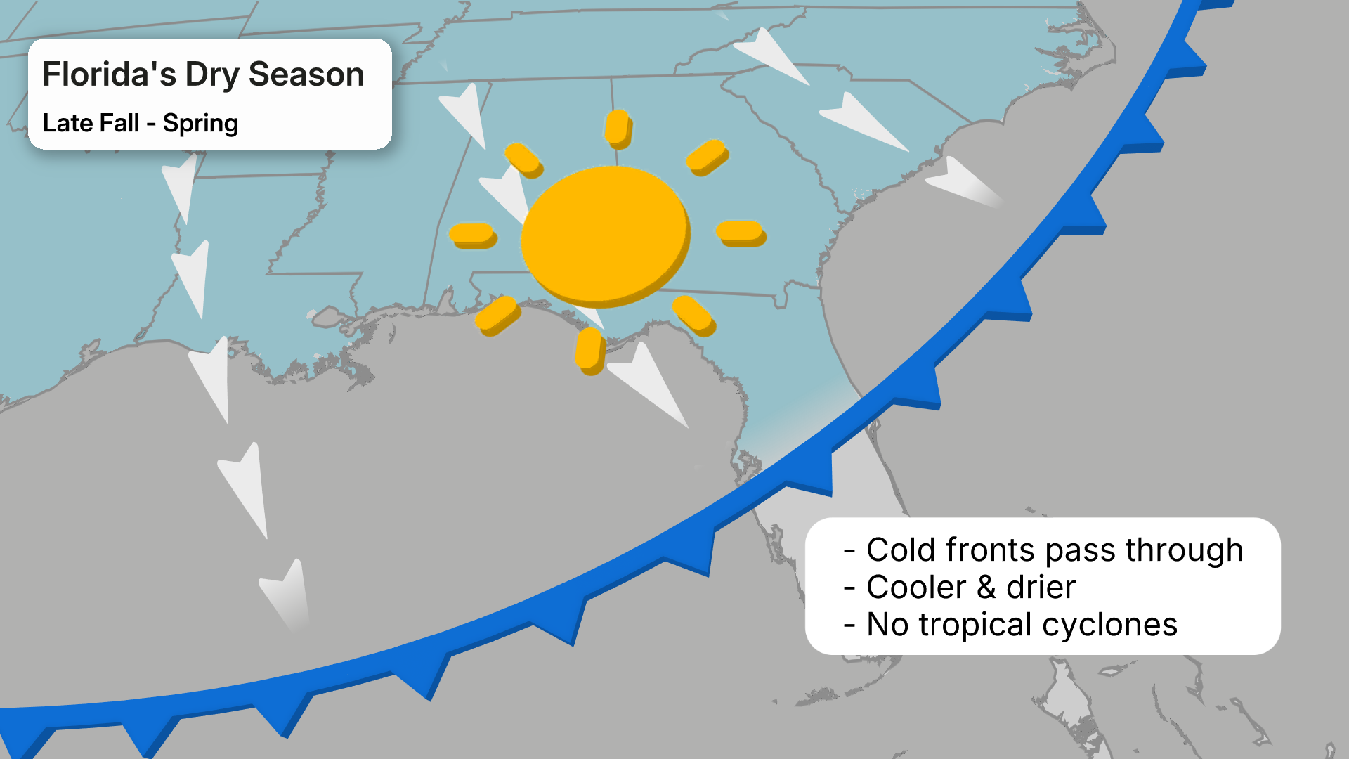 This does not mean Florida stays completely dry, but the amount of precipitation is notably less than during the wet season.
