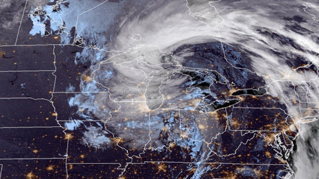 GOES-16 GeoColor satellite image taken Oct. 24, 2017, showing the bombogenesis of a Great Lakes storm. (Note: City lights overlay is applied in these images)