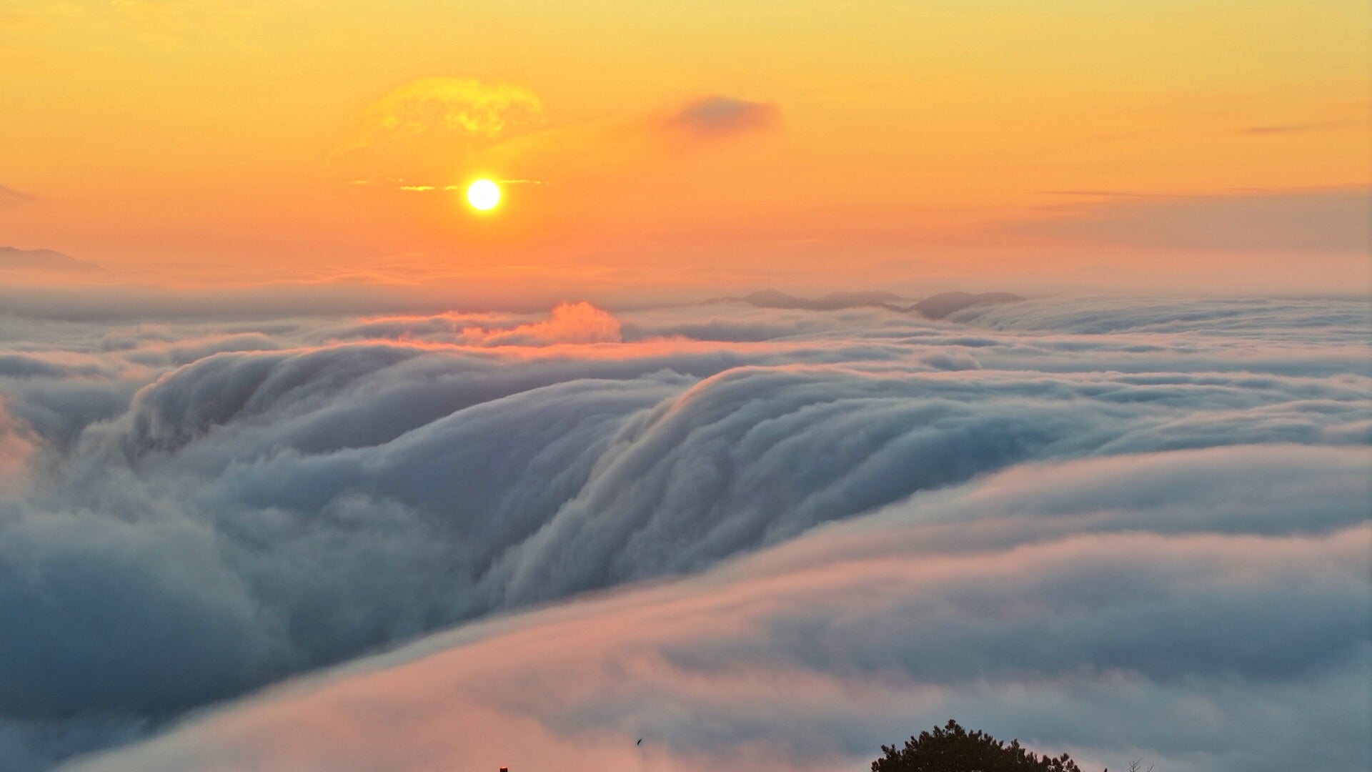 A sea of clouds cascades like a waterfall down the peaks of Yingpan mountain in China.