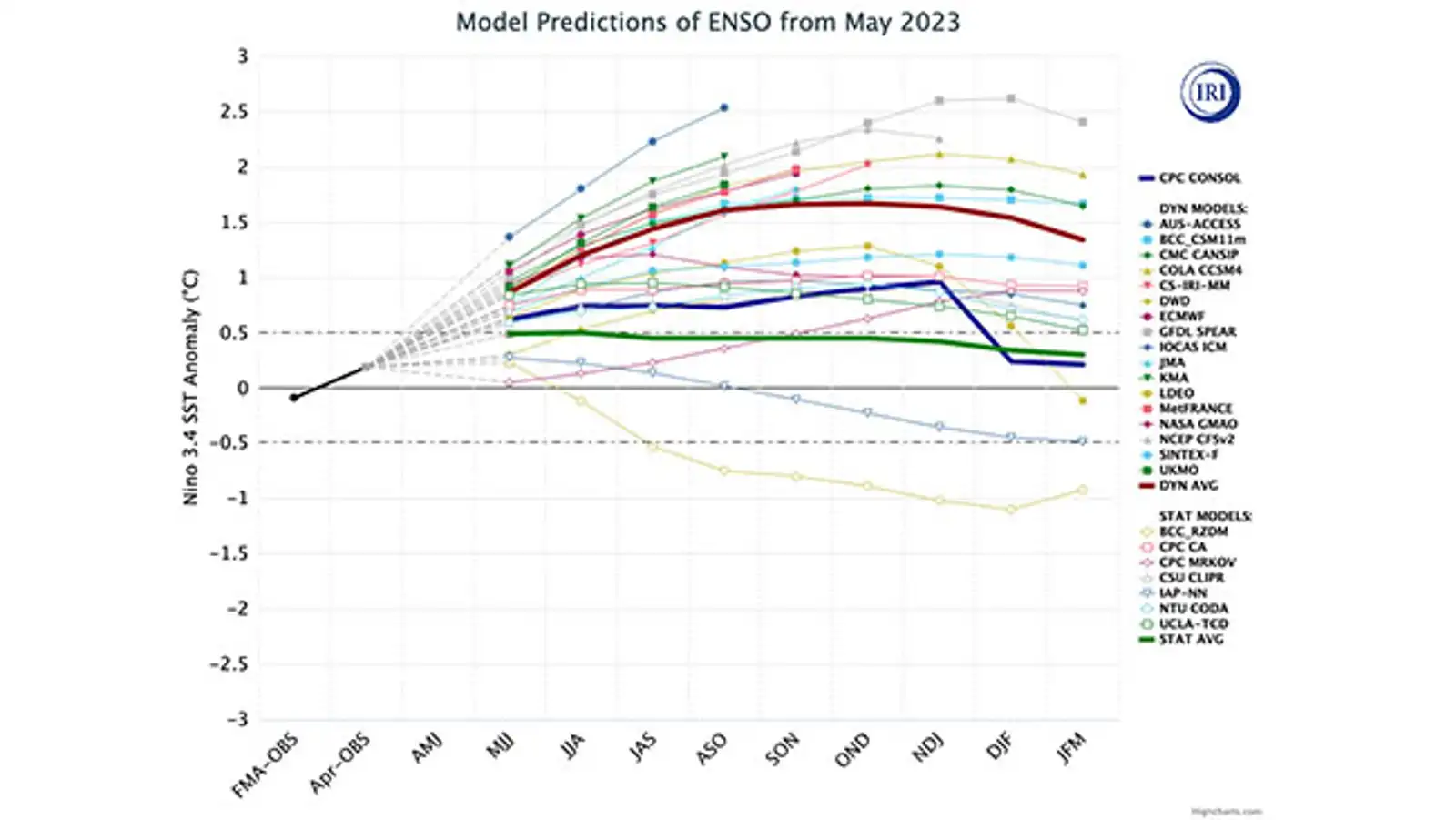 These are model forecasts of sea-surface temperature anomalies (degrees Celsius) in the region we monitor for El Niño through early 2024. Departures of at least 1 degree Celsius are considered moderate El Niños. Those at least 1.5 degrees Celsius are deemed strong El Niños.