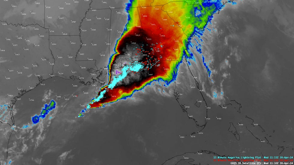 Infrared satellite image and 15-minute lightning strike data for the Pensacola flash flood of April 30, 2014 at 6:15 a.m. CDT. There were 5379 negative lightning strikes, denoted by teal blue minus signs, and 697 positive lightning strikes, denoted by red plus signs, in a 15-minute period ending at 6:15 a.m. CDT.