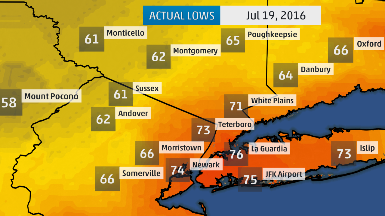 Low temperatures in and around New York City on the morning of July 19, 2016.