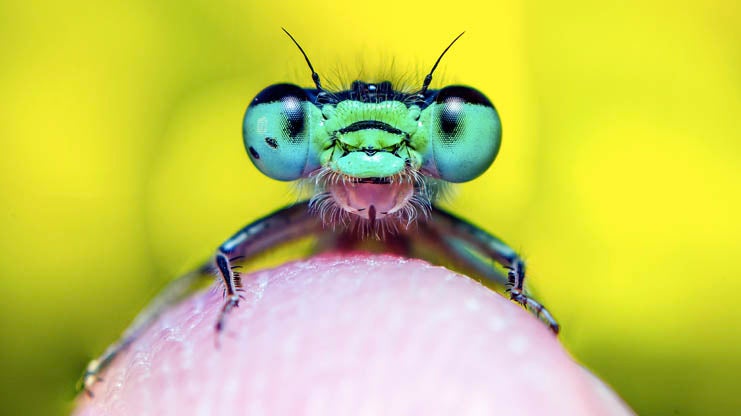 “Adorable damselfly staring curiously at the camera while hanging out on my finger.”