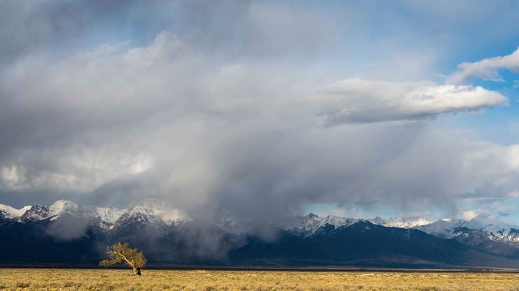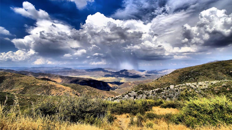 “Overlooking the Anza Borrego Desert Valley an isolated downpour brings water to the desert below.”