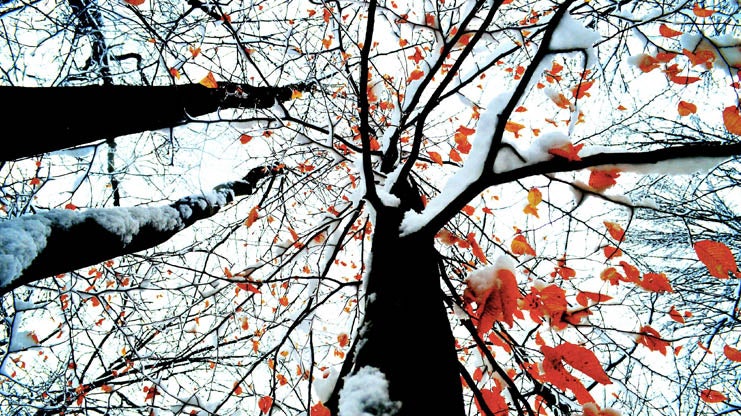 “These gorgeous beech trees are 20 feet from my back door. I had always wanted a photo with snow on them, but got very lucky to get the shot with snow and autumn leaves still clinging to the branches.”