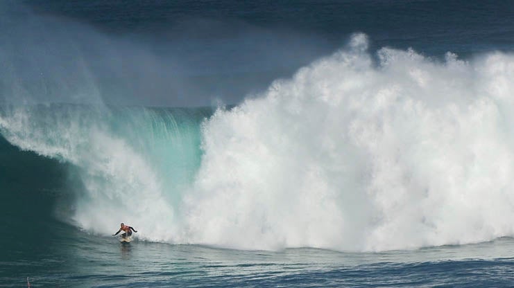 “Kelly Slater takes on a 20- to 25-foot monster wave for a near-perfect score of 98 out of 100 in the Quiksilver in Memory of Eddie Aikau, Big Waves Hawaii. Waves are required to be in the 20- to 30-foot range. Slater was covered by the wave but cruised out from the white water with holding his hand in ‘number one’ sign. Slater has been crowned ASP World Tour Champion a record 11 times, including five consecutive titles in 1994-1998. He is the youngest (at age 20) and the oldest (at age 39) to win the title.”
