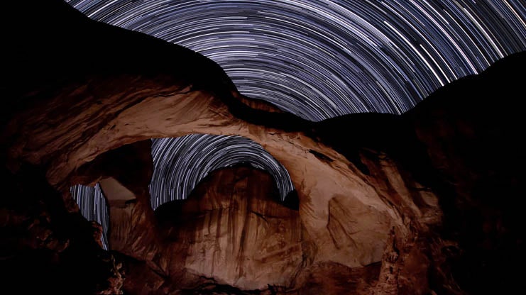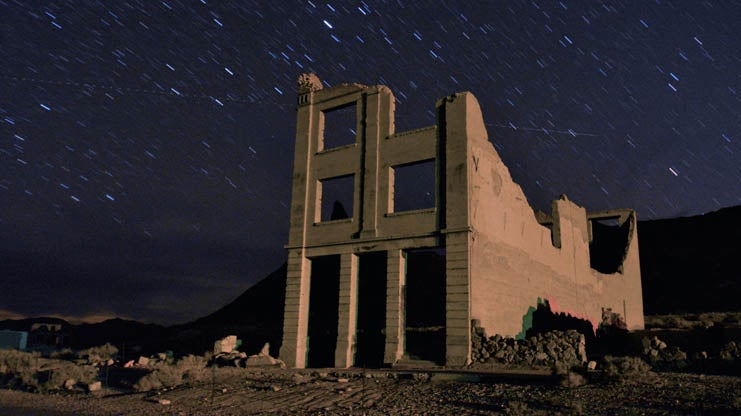 “A one-minute exposure of a starry night in the old ghost town of Rhyolite, Nevada.”