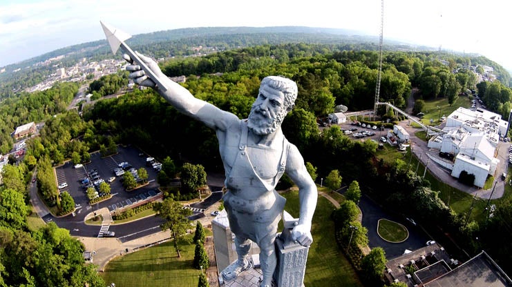 “Vulcan, Birmingham Alabama's colossal statue is the world's largest cast iron statue and considered one of the most memorable works of civic art in the United States. This aerial photograph gives you an epic view of the historic monument from above.”
