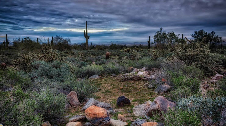 “Desert landscape looking northeast across the vast Phoenix Valley. Rare overcast afternoon in the West Phoenix White Tank Mountains. In the distance you can see the east Phoenix Mountains. This area is known for the petroglyphs let by the ancient local peoples.”