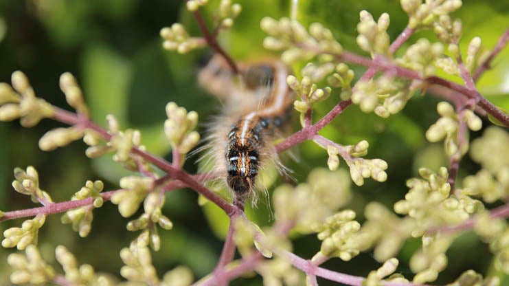 “A caterpillar wandering around on a bush before the flowers are in bloom.”