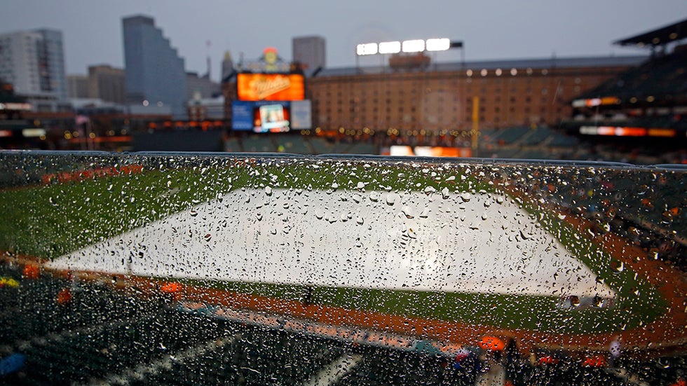 Raindrops coat a pane of glass above a tarp-covered infield during a rain delay in an opening day baseball game between the Baltimore Orioles and the Minnesota Twins in Baltimore, Monday, April 4, 2016.