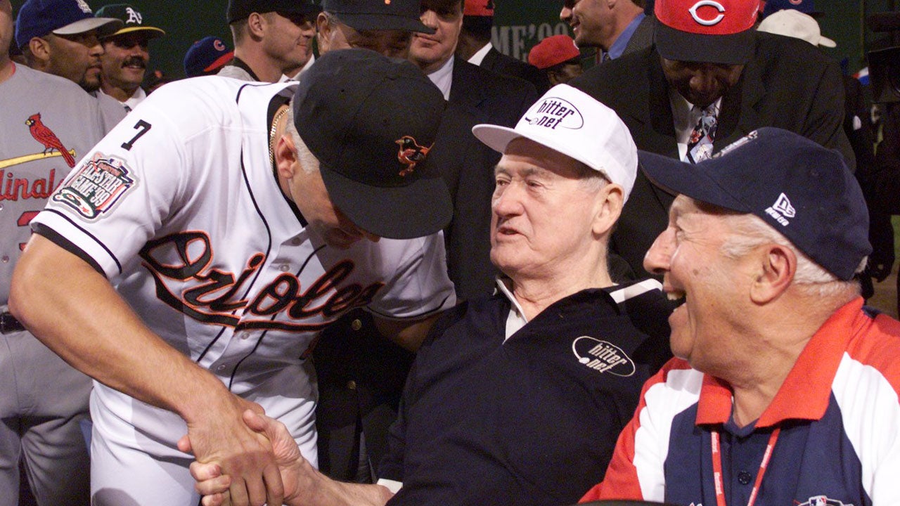 Ted Williams is greeted on the field after he threw out the ceremonial first pitch prior to the start of the 1999 All-Star Game at Fenway Park in Boston on July 13, 1999.