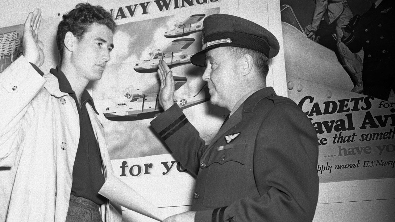 Williams is sworn in as a naval aviation cadet by Lt. F. T. Donahue, in charge of cadet recruiting in the Boston area. The 23-year-old slugger and the center of one of World War II's biggest draft controversies had kept from even his teammates his plans to enlist.