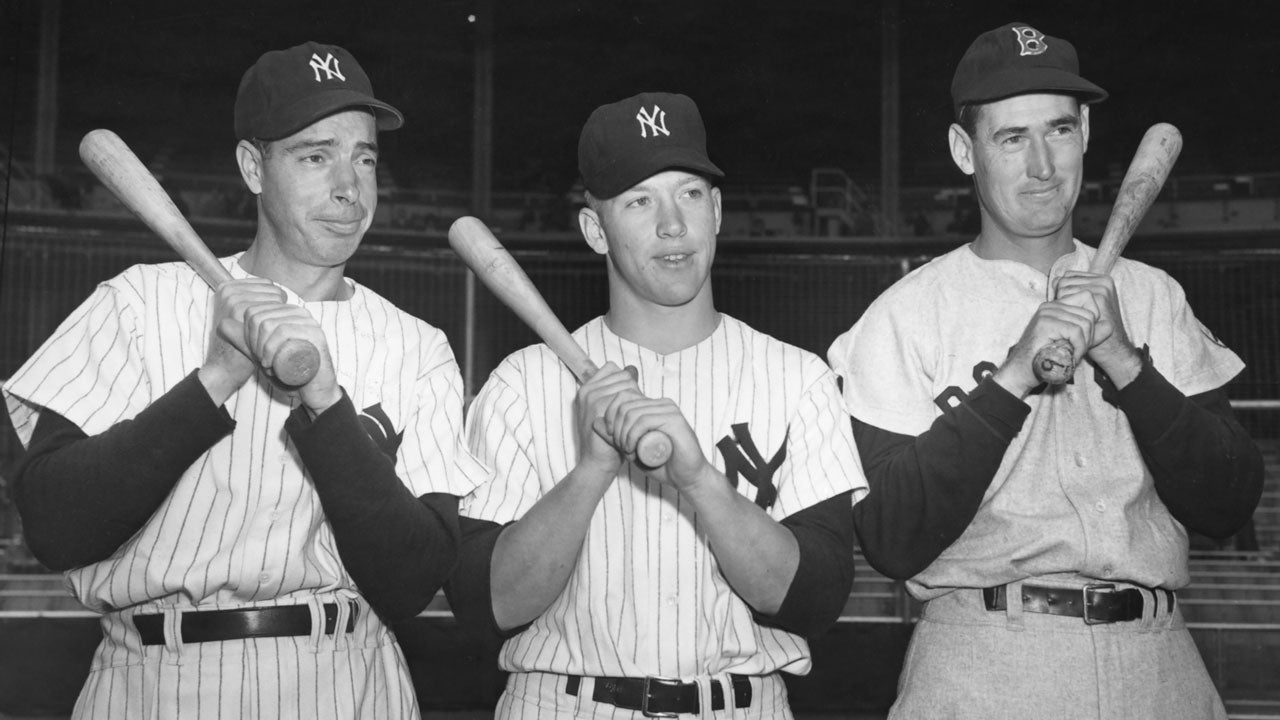 Joe DiMaggio (left) and then-rookie Mickey Mantle (center) of the New York Yankees pose with Ted Williams (right) of the Boston Red Sox before Opening Day on April 17, 1951, at Yankee Stadium in New York, New York.