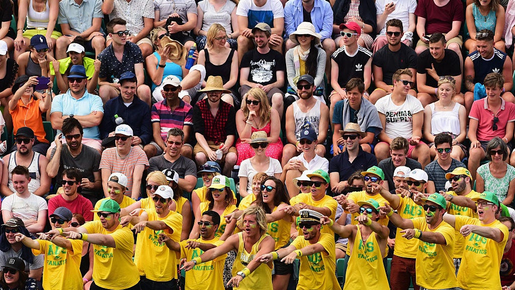 Australian fans show their support for Nick Kyrgios of Australia as he competes in his Gentlemen's Singles Second Round match against Juan Monaco of Argentina during day three of the Wimbledon Lawn Tennis Championships at the All England Lawn Tennis and Croquet Club on July 1, 2015, in London, England.