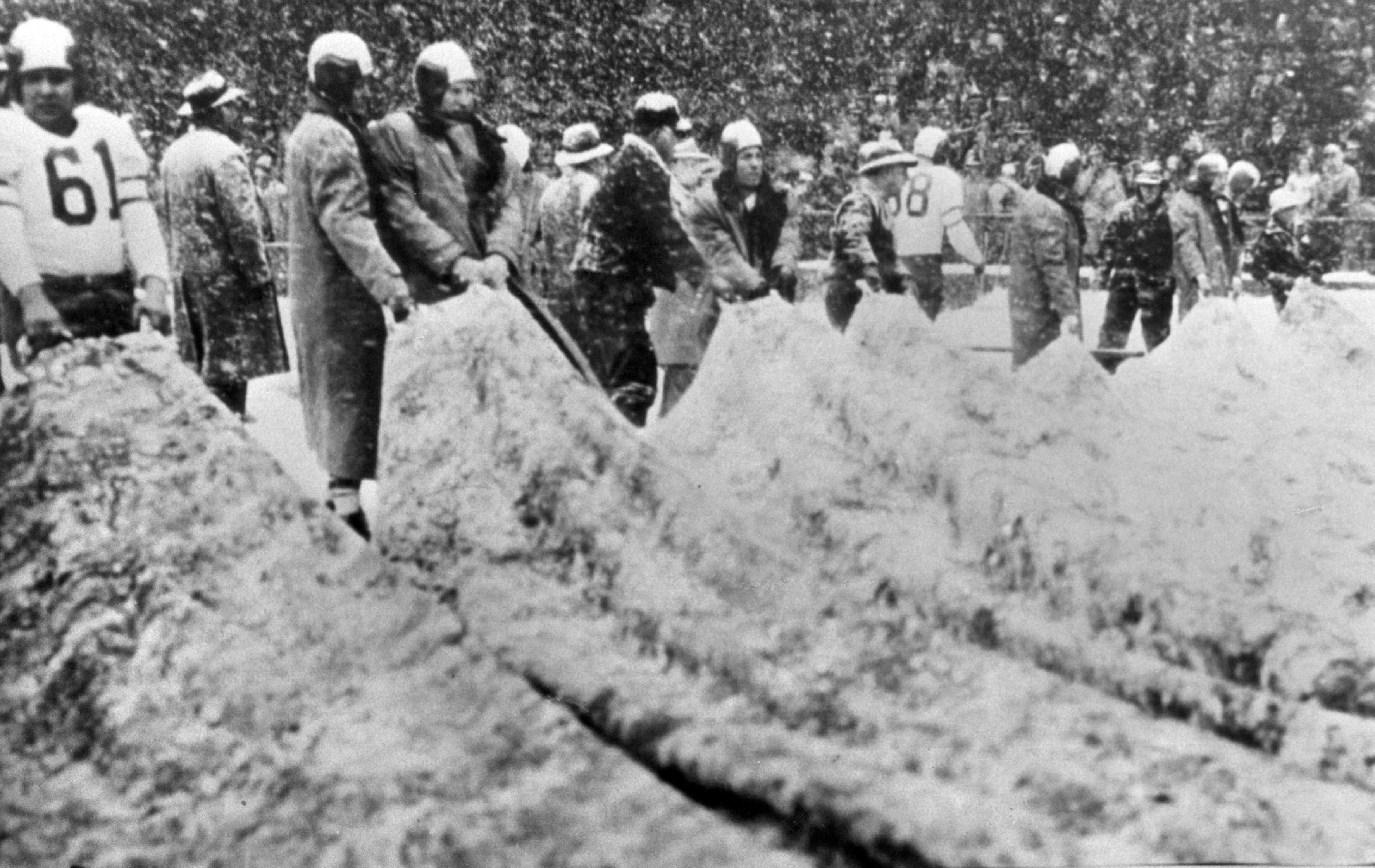 Members of the Chicago Cardinals help the maintenance men clear away the heavy snow (which delayed the game by a half-hour) before the 1948 NFL Championship Game, a 7-0 loss to the Philadelphia Eagles on Dec. 19, 1948, at Shibe Park in Philadelphia, Pennsylvania.