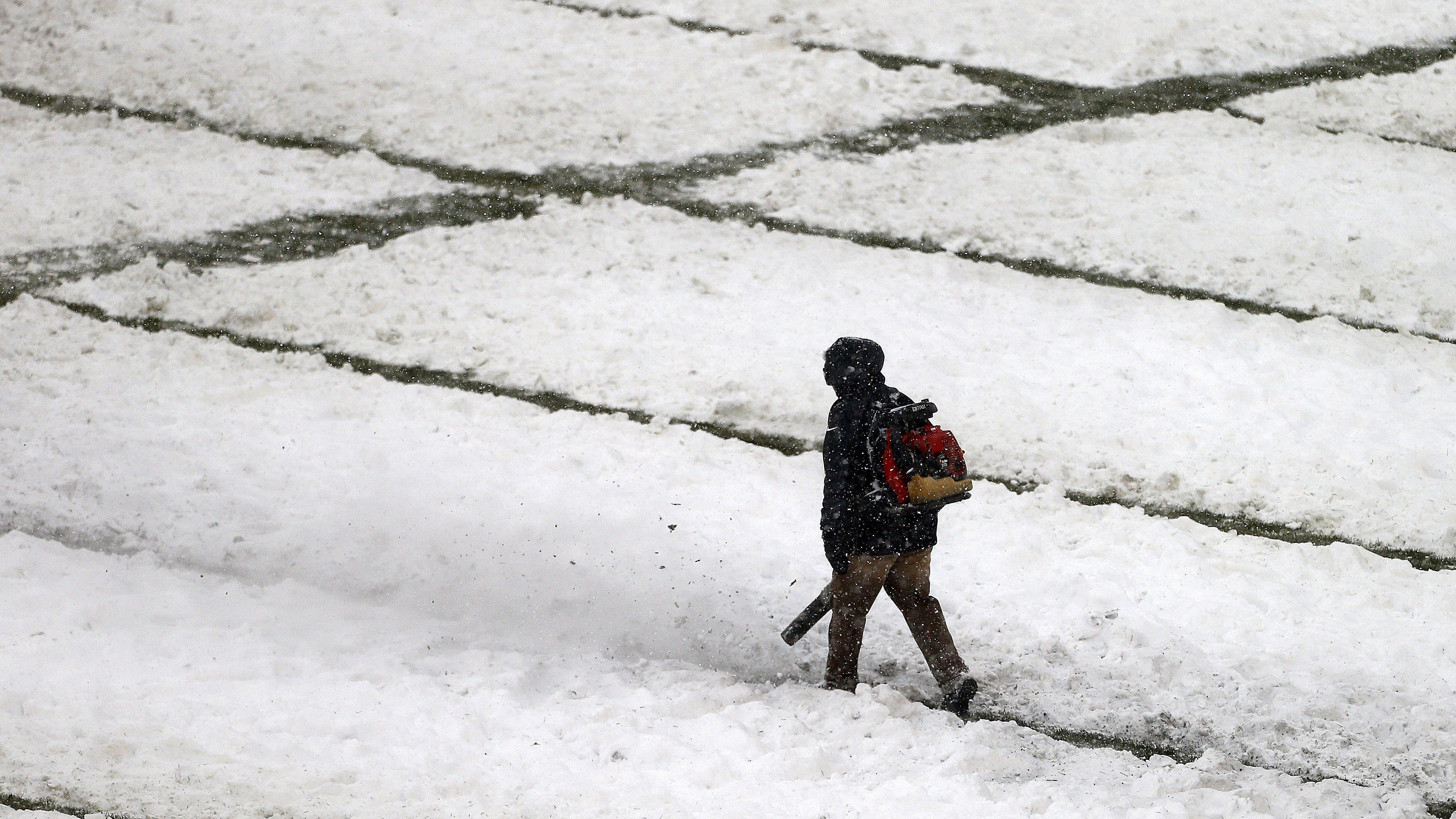 A member of the grounds crew uses a blower to clear the yard lines during a game between the Philadelphia Eagles and Detroit Lions at Lincoln Financial Field on Dec. 8, 2013, in Philadelphia, Pennsylvania. The Eagles defeated the Lions 34-20.