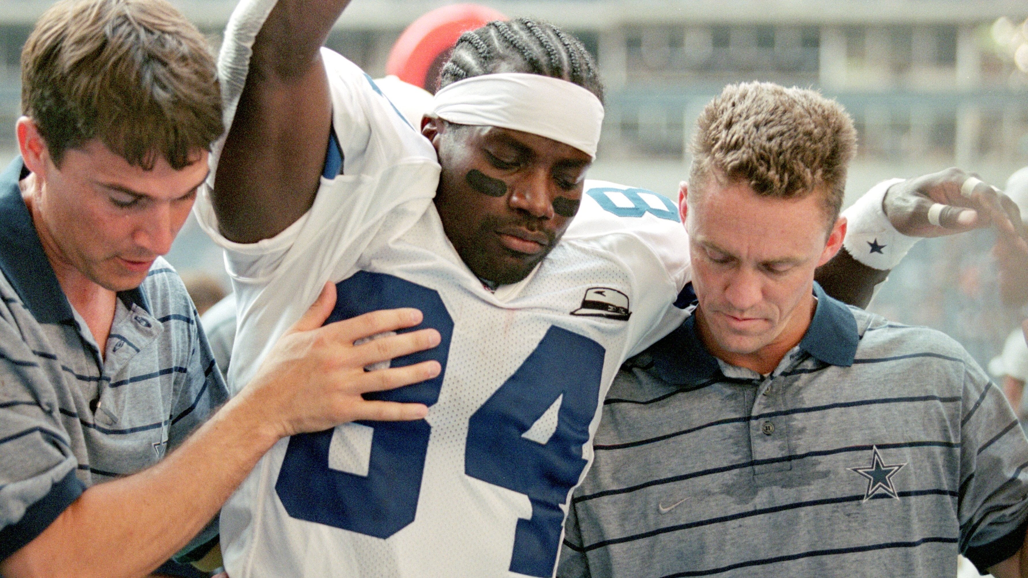 Joey Galloway #84 of the Dallas Cowboys is carried off the field with a season-ending injury during a game against the Philadelphia Eagles at Texas Stadium in Irving, Texas. The Eagles defeated the Cowboys 41-14.