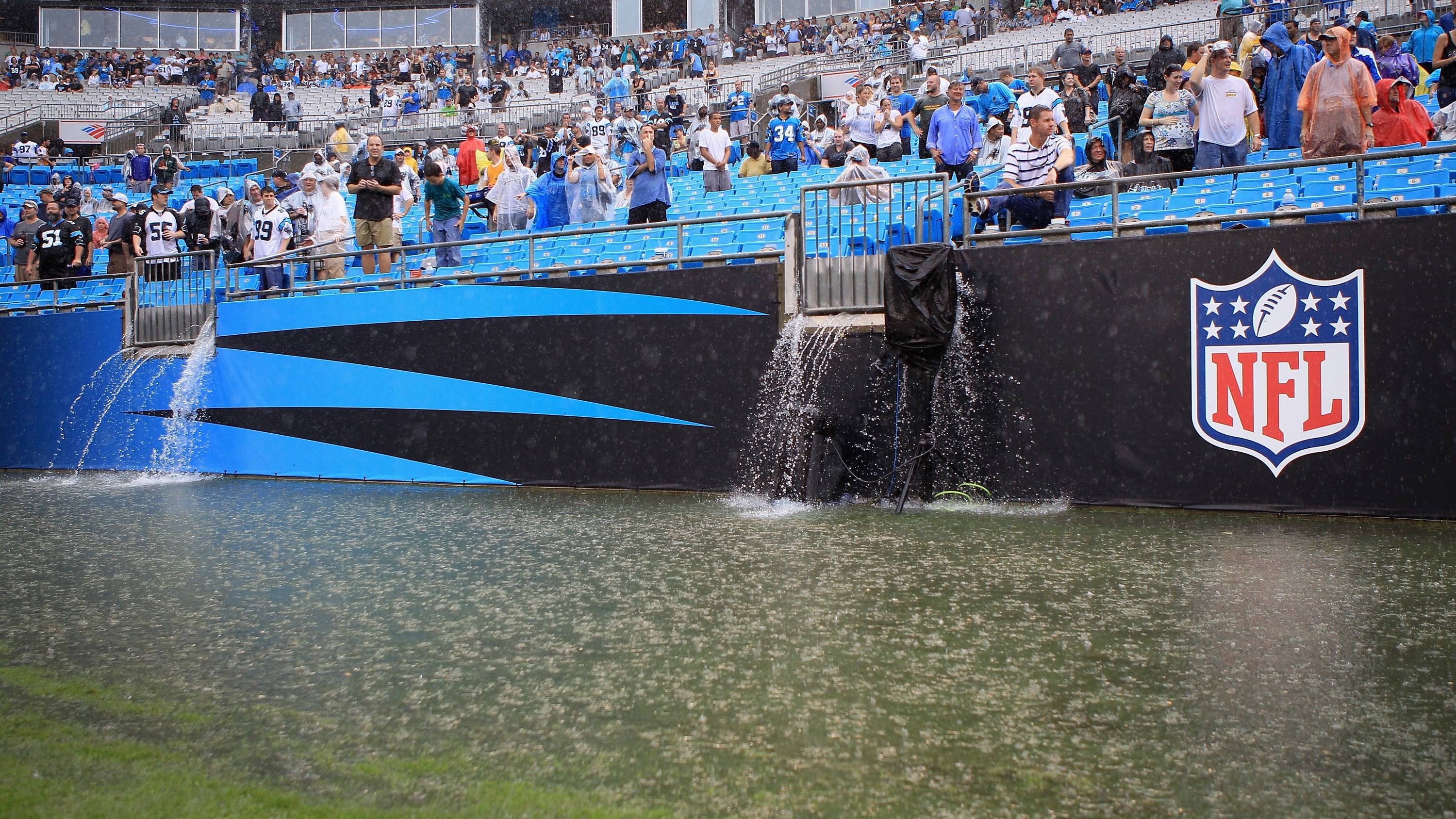 Rain falls on the field during the game between the Carolina Panthers and Jacksonville Jaguars at Bank of America Stadium on Sept. 25, 2011, in Charlotte, North Carolina.