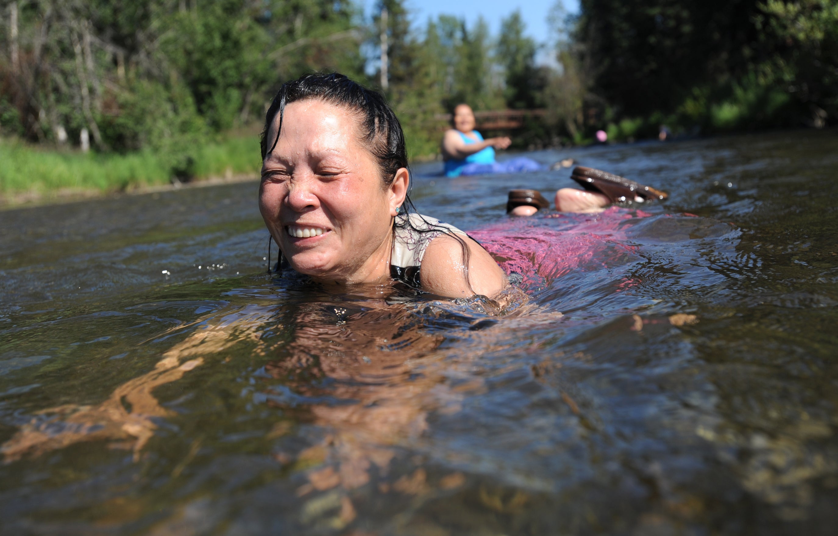 Kan Kil floats face-first in the cool waters of Campbell Creek, near Lake Otis Parkway, while beating the heat on Tuesday, July 30, 2013. Anchorage broke a record on Tuesday for hitting 70 degrees or more for the 14th straight day. (AP Photo/Anchorage Daily News, Bill Roth)