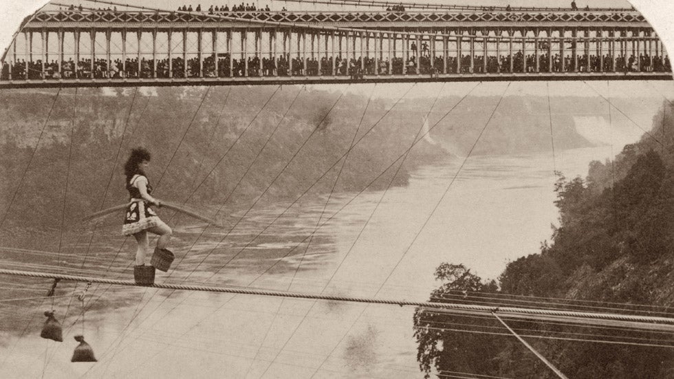 Italian tightrope walker Maria Spelterini crosses the Niagara River gorge on a tightrope, with two peach baskets on her feet, July 1876. The Niagara Falls Suspension Bridge behind is crowded with spectators. (George Barker/Hulton Archive/Getty Images)